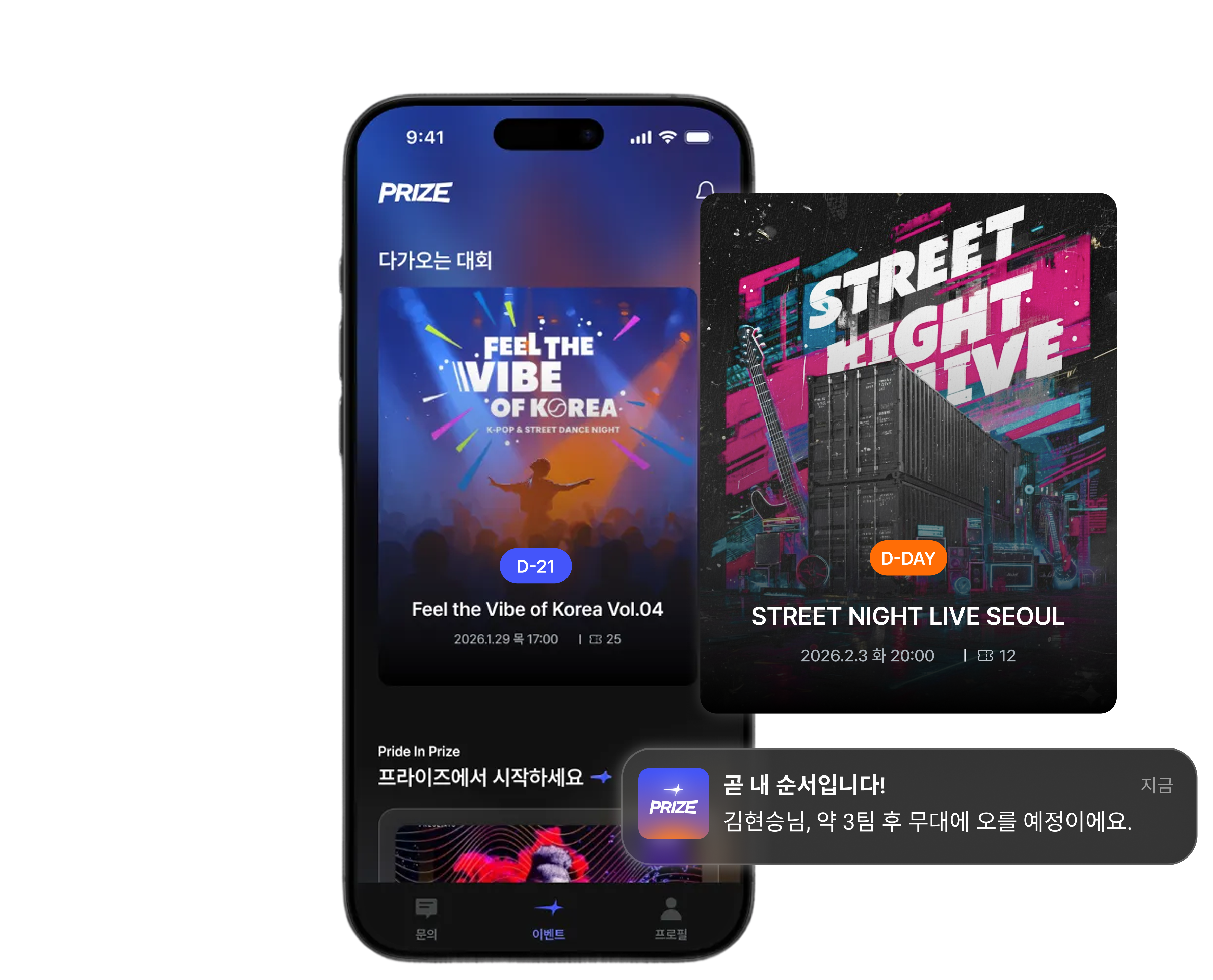 대회는 타이밍이 전부입니다. 다가오는 대회와 내 순서를 실시간으로 알려줍니다.